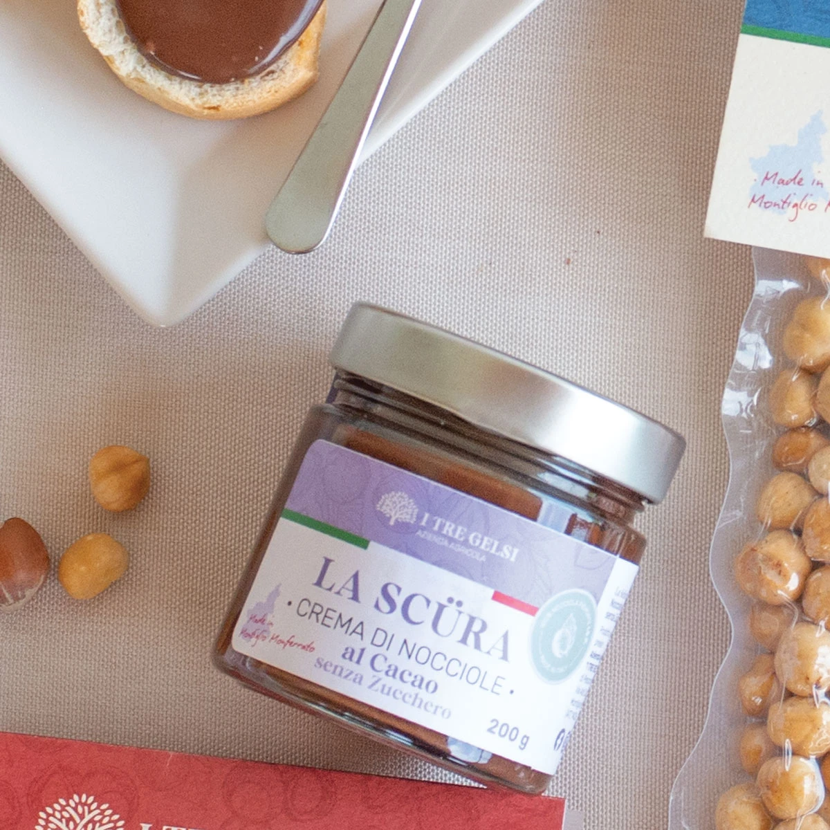Il gusto ricco della Nocciola Piemonte IGP e del cacao, ma senza zuccheri aggiunti. Un piacere intenso per chi non vuole rinunciare al dolce. Questa versione de La Scüra è perfetta per gli sportivi, per regimi alimentari poveri di zuccheri. Prodotta dall'azienda agricola I Tre Gelsi.