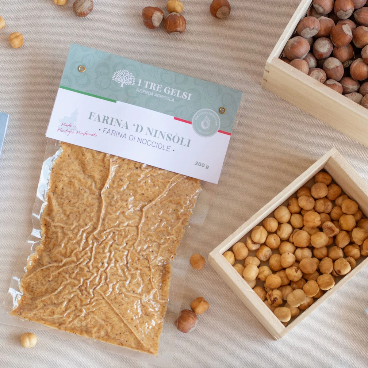 La base per dolci senza glutine. Farina finissima ottenuta dalla macinazione delle nostre Nocciole Piemonte IGP tostate. È la Farina ‘d Ninsòli, la base di molte ricette dell'azienda agricola I Tre Gelsi. Perfetta per impasti, dolci da forno e preparazioni senza glutine. Aggiunge umidità e un sapore intenso. Sorprendente anche per le pietanze salate, come impanatura per formaggi a pasta molle o da aggiungere agli impasti salati!