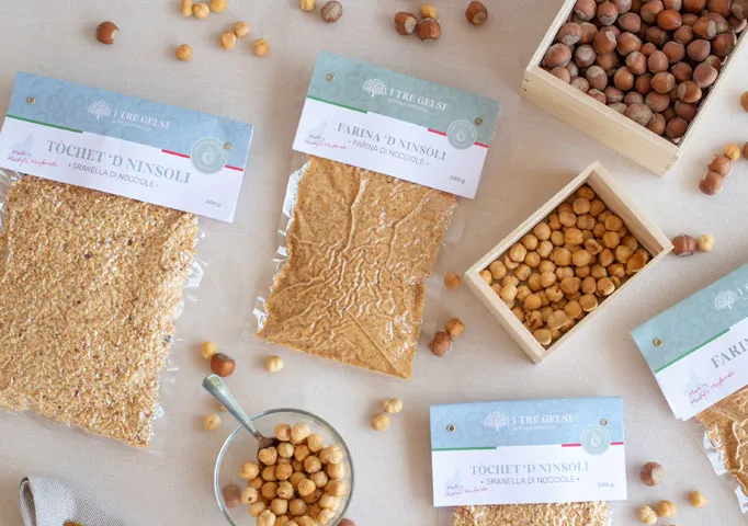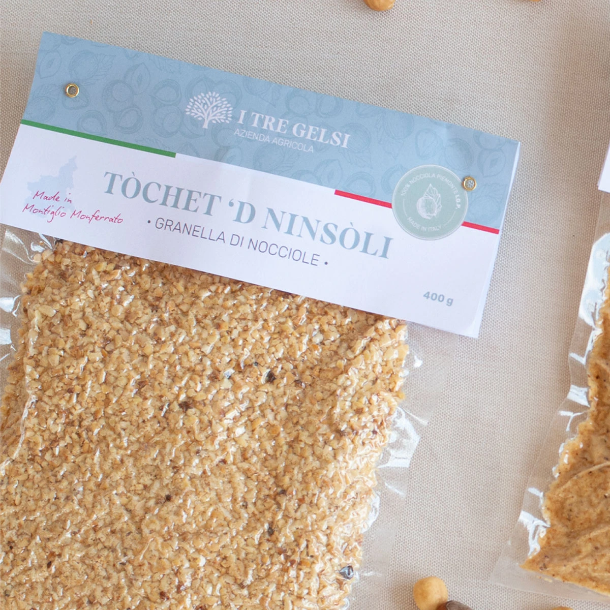 Tòchet ‘d Ninsòli è la granella ottenuta dalla macinazione grossolana delle Nocciole Piemonte IGP, già tostate. Essenziale per decorare dolci, gelati, praline o per dare una nota croccante al cioccolato. Sorprendente anche sulle pietanze salate come i formaggi e i risotti. L'azienda agricola I Tre Gelsi la utilizza per un topping perfetto.