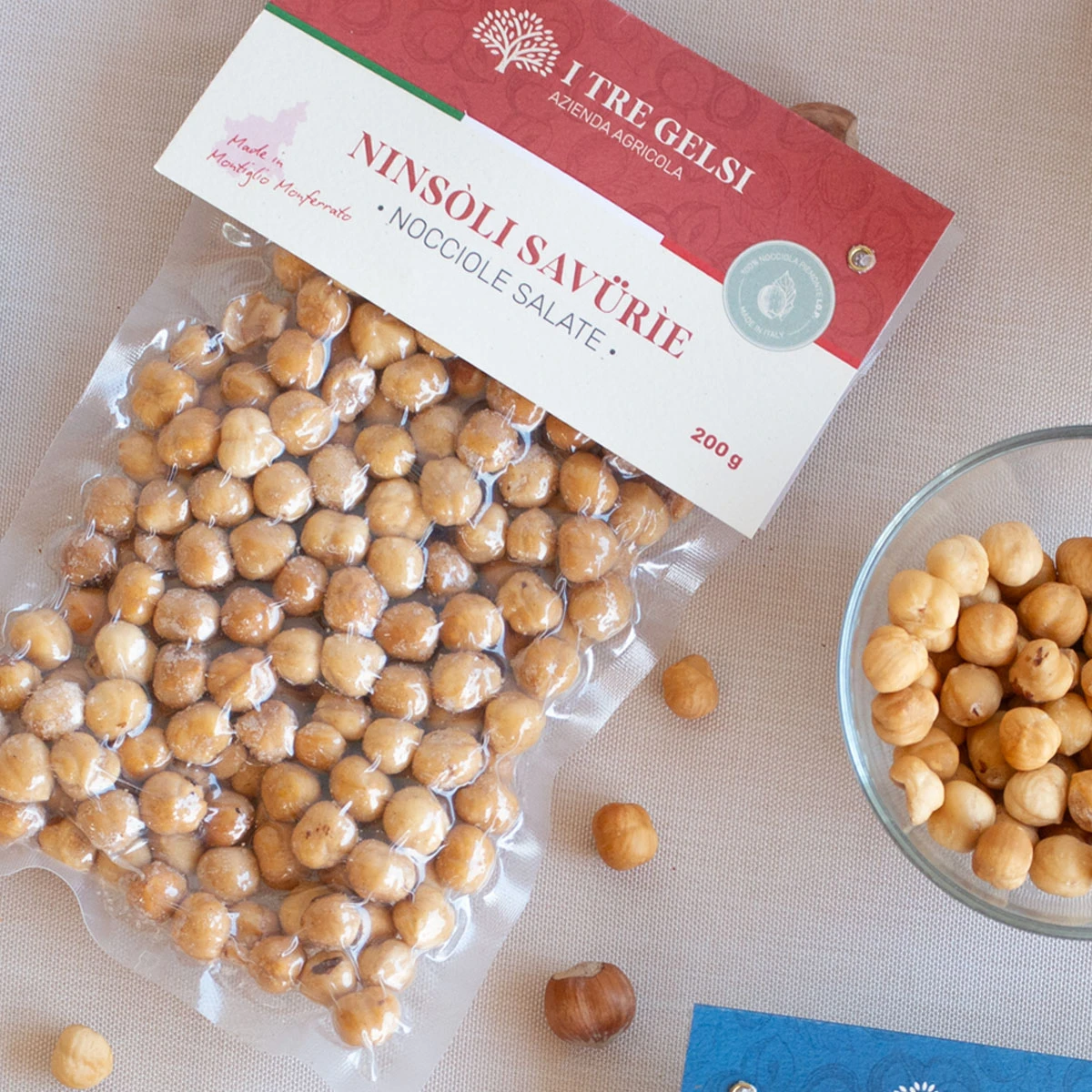 La croccantezza della Nocciola Piemonte IGP unita alla sapidità di un pizzico di sale. Le nostre Ninsòli Savürìe sono ideali per un aperitivo sfizioso, come accompagnamento a formaggi e salumi. L'azienda agricola I Tre Gelsi le propone per un break salato e irresistibile!